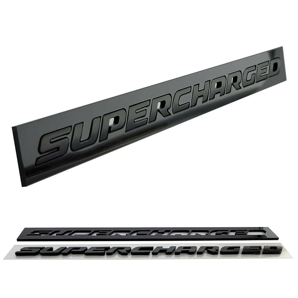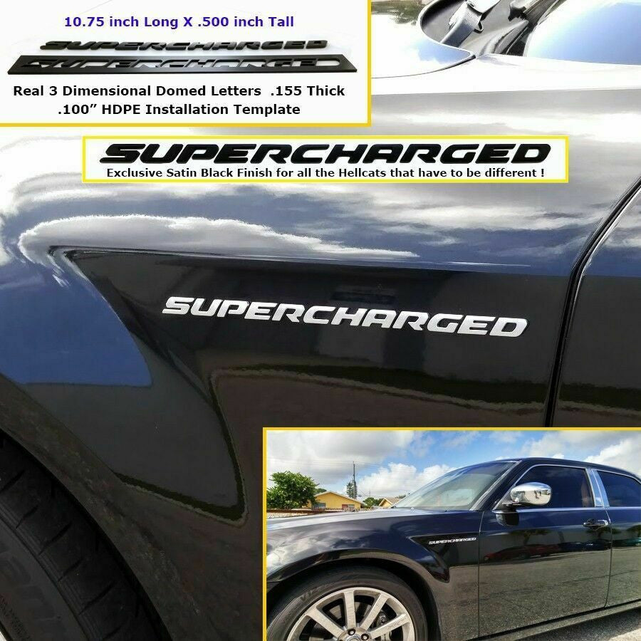 Supercharged emblem for Dodge Hemi vehicles. Simply install the letters in the installation template. Then you will have a perfectly straight and flawless installation wherever you choose to install your new SUPERCHARGED emblem. This is the only installation template that can be fixed to the car for an incredibly precise installation without headaches! These look incredible on hoods fenders trunks decklids and just about wherever you can think of showing them off. The picture is installed on a Hellcat Demon and a 300 SRT8.