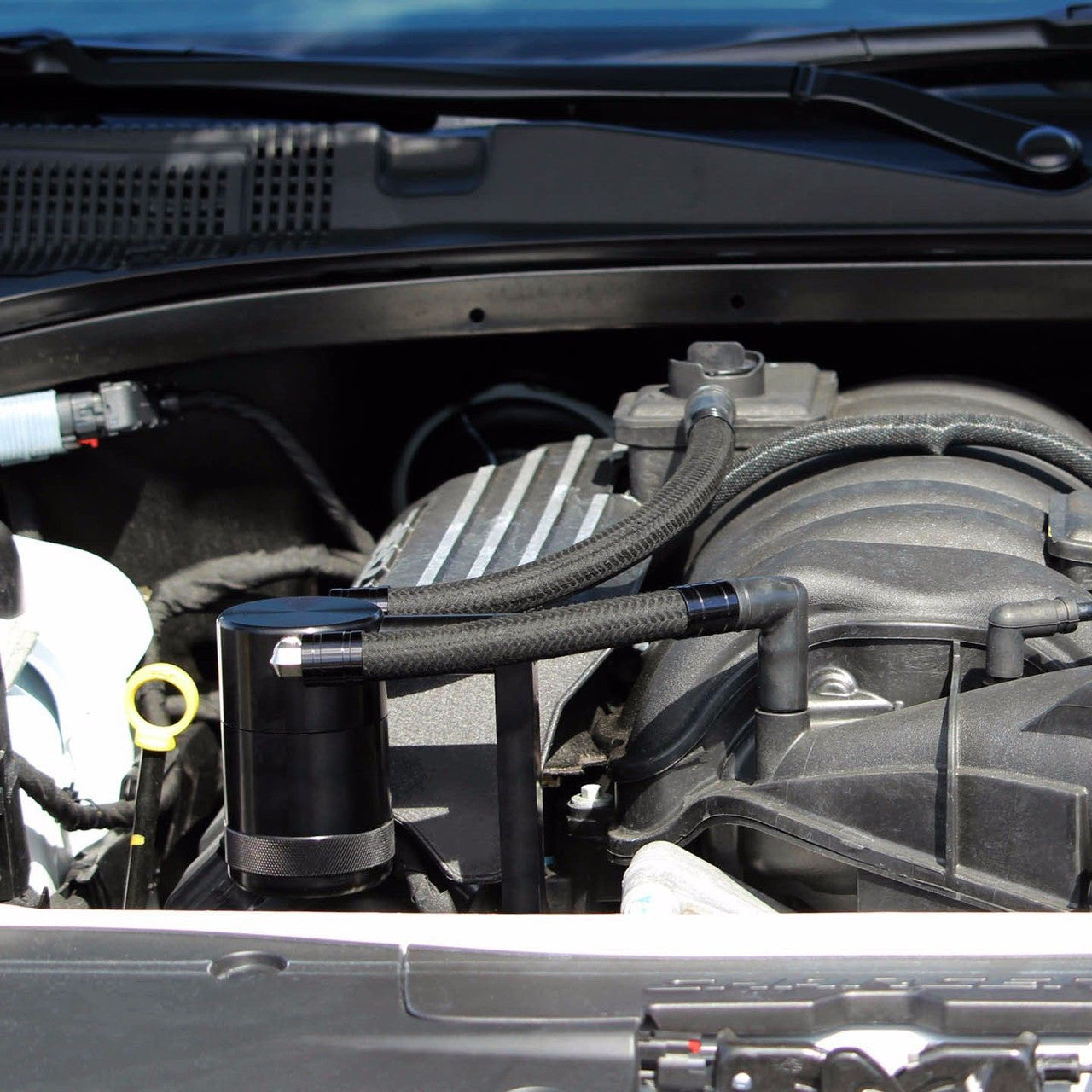 Brand New UPR Signature Series Billet Catch Can System with Mounting Bracket for your 2011 to Present 6.4L equipped Challenger, Charger, and 300. This Catch Can was developed to out perform all the other 2 chamber catch cans with a patented internal diffuser system that forces the oil to be released into the catch can from a lower chamber then the fresh air can exit through the upper chamber. This is because all the traditional 2 chamber catch cans have two chambers side by side and with a screen that separates them. Side by Side chambers with a simple screen or honeycomb filter allow oil to be sucked right across and out the exit port of the catch can.