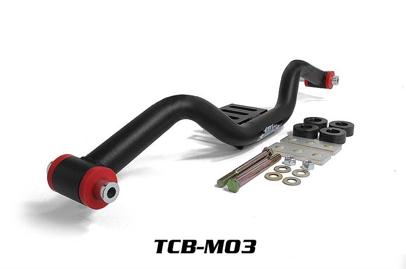 This unique single tube design adds stiffness and strength far beyond that of the OEM versions. Simply slide the mounting sleeves and reposition the spacers to cover AOD, AODE, 4R70W, C6, G101A, GF5R, T-5, TKO, TKX,TR-3550, **4L60E, G101A applications. The crossmember is engineered to work with OEM and aftermarket transmission mounts; all while maintaining your current pinion angle. Low deflection polyurethane bushings are used in the mounts to dampen driveline vibrations and noise. For racing applications the polyurethane bushings can be replaced by optional solid bushings.